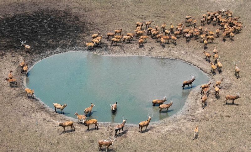 在江蘇大豐麋鹿國家級自然保護(hù)區(qū),一群麋鹿在水塘附近棲息(6月28日無人機拍攝)。近年來,隨著生態(tài)環(huán)境的改善和動物保護(hù)力度的加大,江蘇大豐麋鹿國家級自然保護(hù)區(qū)麋鹿的繁衍生息獲得優(yōu)越的外部條件,目前種群總數(shù)已達(dá)5016頭。