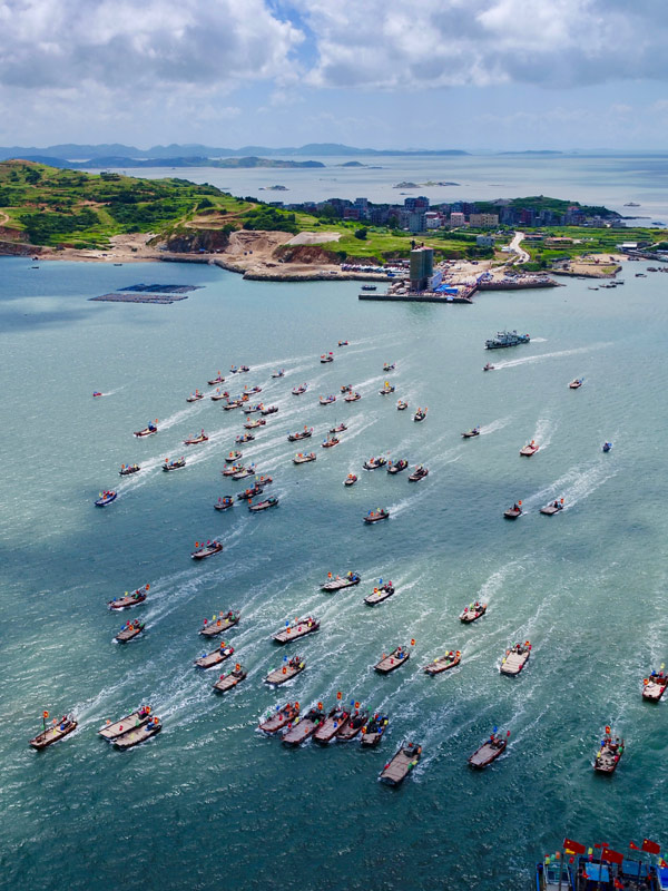 在福建省福清市沙埔鎮(zhèn)舉行的2019年首屆福清開漁節(jié)上,漁船駛向大海(8月3日無人機拍攝)。