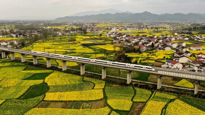 列車通過陜西省漢中市南鄭區(qū)新集鎮(zhèn)油菜花海(3月21日無人機拍攝)。近年來,陜西省以改善環(huán)境質(zhì)量和保障環(huán)境安全為目標(biāo),以藍(lán)天、碧水、凈土、青山四場保衛(wèi)戰(zhàn)為重點,加快改善生態(tài)環(huán)境質(zhì)量。