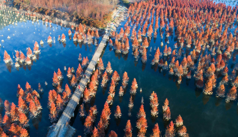 云南昆明水杉濕地冬日一景(1月5日無人機拍攝)。云南省被譽為“動物王國”和“植物王國”,當(dāng)前生物多樣性相關(guān)指標(biāo)居全國第1位,森林覆蓋率60.3%,居全國前列。
